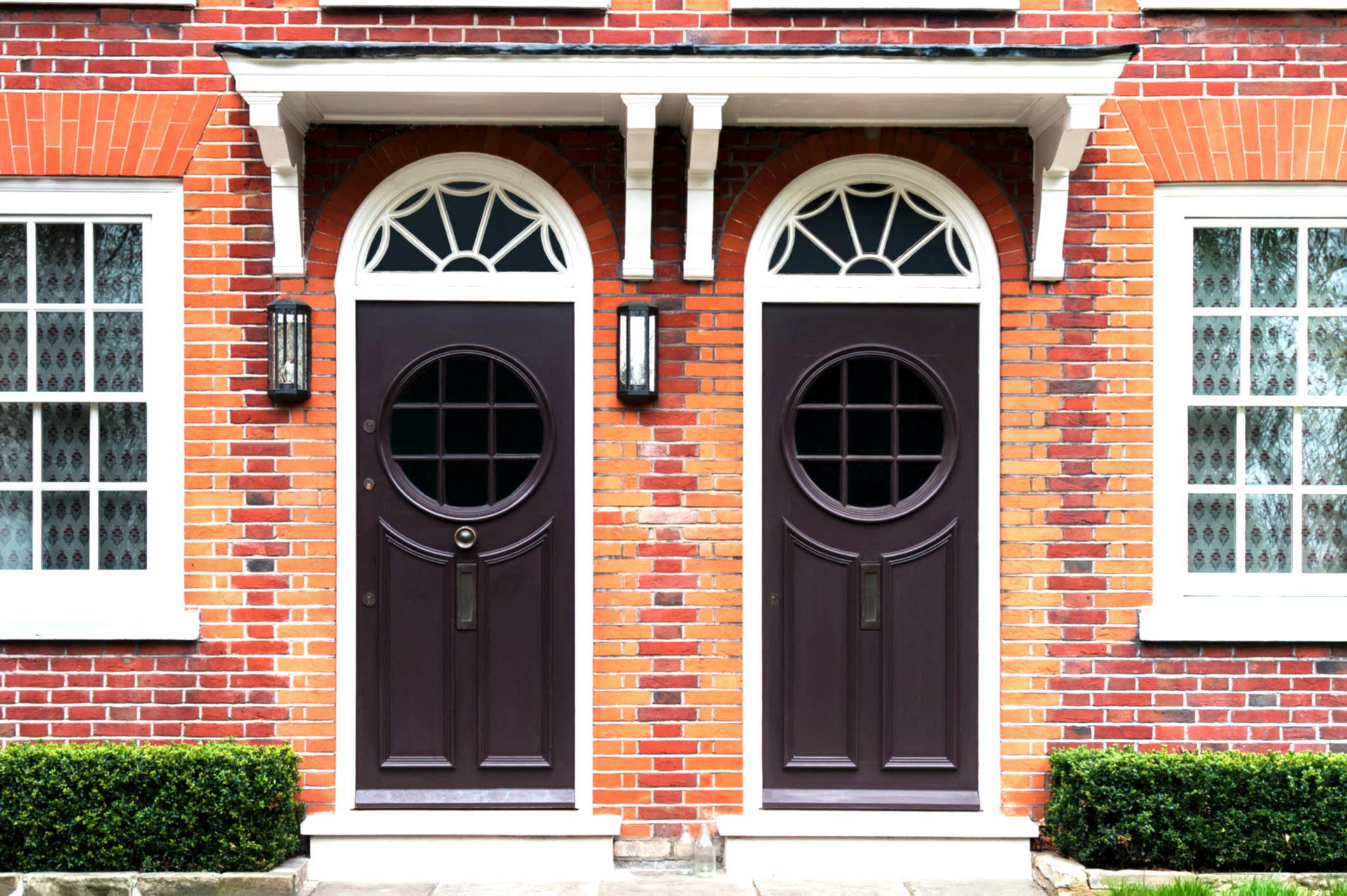 - Twin Arched Dark Doors in Red Brick Wall with White Details